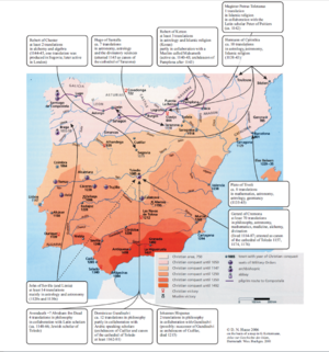 Übersichtskarte zu den Übersetzern aus: D.N. Hasse, 'The Social Conditions of the Arabic-(Hebrew-)Latin Translation Movements in Medieval Spain and in the Renaissance', in: A. Speer, L. Wegener, Hrsg., Wissen über Grenzen (Berlin: de Gruyter, 2006), S. 68-86 und 806.)