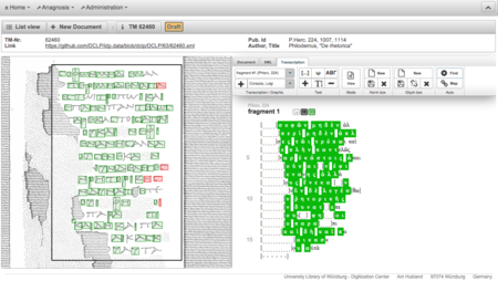 Aus der DCLP-Datenbank werden Texte und Metadaten in den Anagnosis-Editor importiert. Die Metadaten zu den einzelnen Papyrustexten beinhalten bereits einen Link zur URL der jeweiligen online-Abbildungen, auf die der Editor ebenso zugreift. Einzelne Texteinheiten (Kolumnen/Fragmente) des Transkriptes bekommen eine ID und werden über diese mit dem entsprechenden Bild verknüpft.